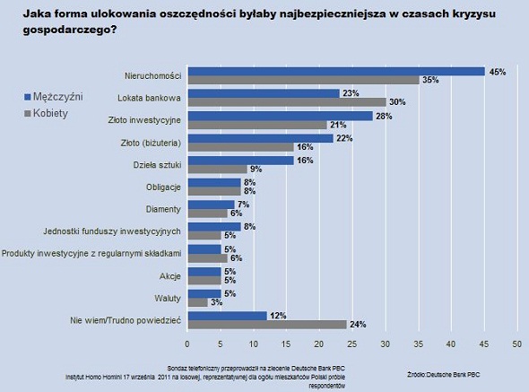 Chęć lokowania oszczędności w nieruchomości nieco częściej wyrażali mężczyźni (45 proc.) niż kobiety (35 proc.), osoby z wyższym wykształceniem (ponad 50 proc.) i osoby raczej młode (56 proc. osób w wieku 18-24 lata, aż 59 proc. 35-44-latków i tylko 21 proc. osób po 65. roku życia). Kolejnym najczęściej wskazywanym bezpiecznym sposobem na ulokowanie pieniędzy jest lokata bankowa (wybrało ją 27 proc. ankietowanych). Takie rozwiązanie miało nieznacznie więcej wskazań wśród badanych pań (30 proc., przy 23 proc. wskazań mężczyzn). Preferują je osoby z dużych miast (36 proc.) i posiadające wyższe wykształcenie (32,4 proc.).